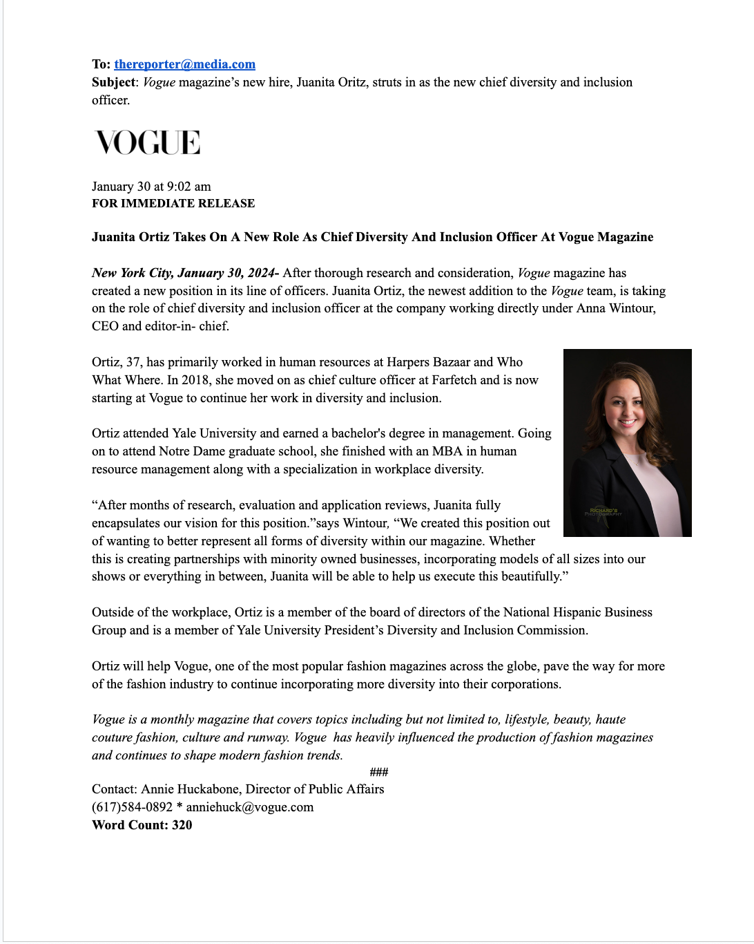 Showcasing my knowledge on press releases, this piece encompasses my knowledge on the different forms of PR writing and how to properly optimize information that best caters to the audience, tone and specific PR writing structure.