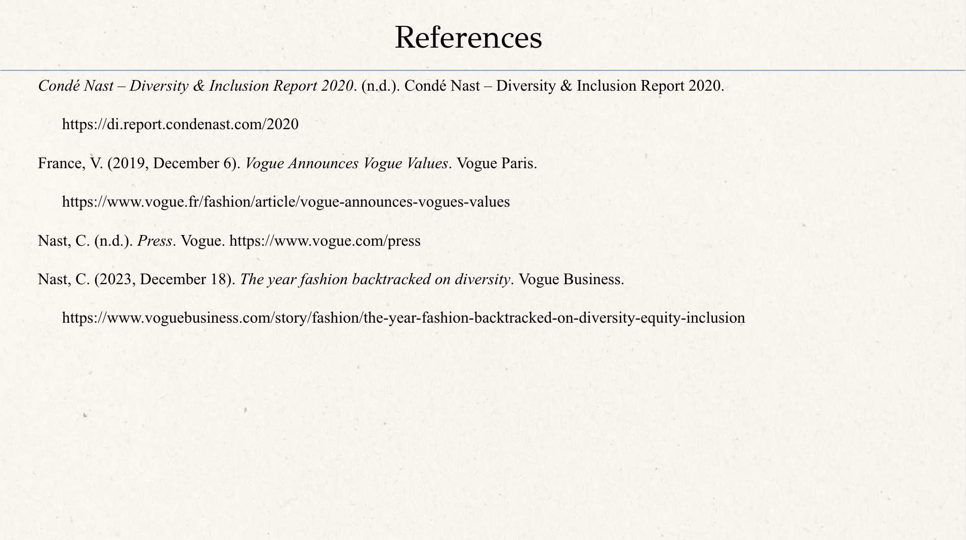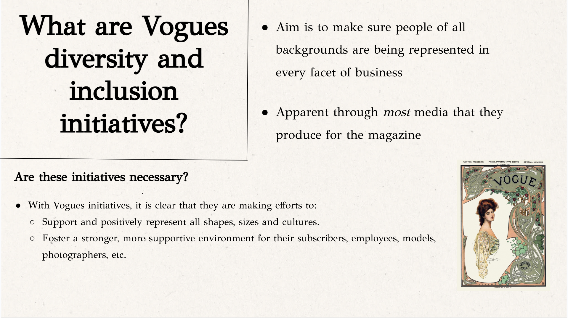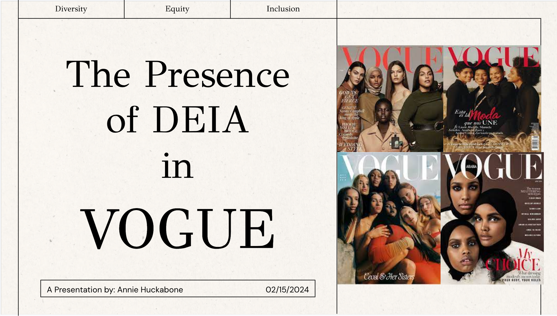 A presentation and analysis on Vogue's DEIA initiatives, mission statement and efforts in the media.